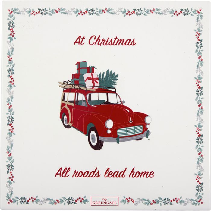 Deska wykonana jest z białej ceramiki i od spodu wykończona korkiem. Zdobiona jest uroczym motywem świątecznym w postaci czerwonego auta z prezentami i choinką oraz napisem w języku angielskim "All roads lead home" co oznacza " Wszystkie drogi prowadzą do domu."