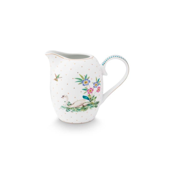 Dzbanuszek ozdobiony jest złotymi kropkami, egzotycznymi kwiatami, palmami oraz uroczym łabędziem.