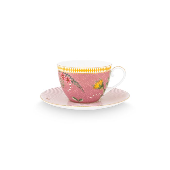 Filiżanka porcelanowa La Majorelle Pink to wyjątkowa porcelana stworzona przez markę PiP Studio. La Majorelle to wiosenno-letnia kolekcja łącząca piękną roślinność oraz dorodne palmy. Zastawę stołową z tej serii zdobią również kropeczki i paseczki, co w efekcie daje bajeczny efekt. Szyku i elegancji dodaje porcelanie złote wykończenie. Pojemność filiżanki: 280 ml
