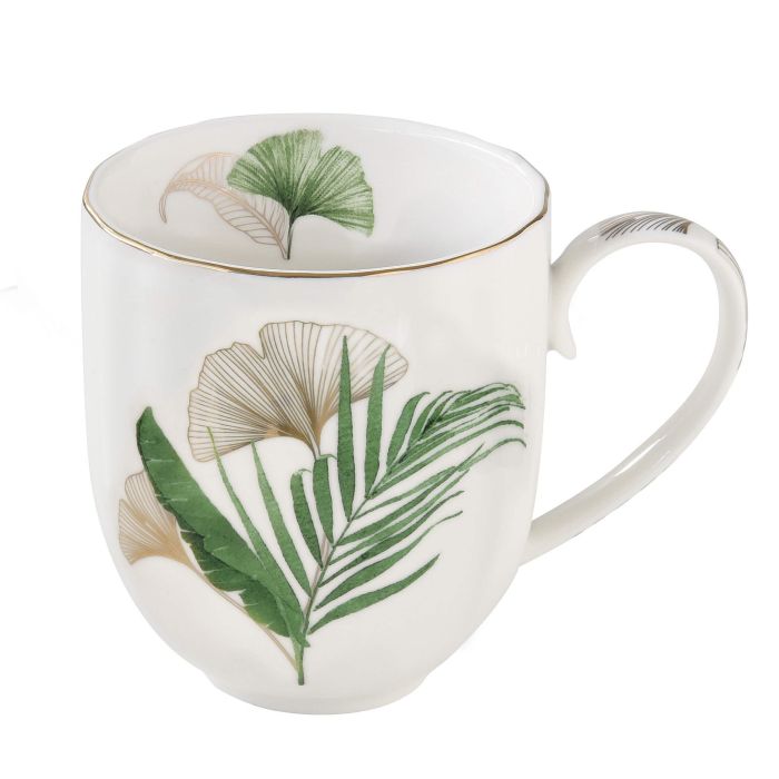 Kubek pakowany jest w ozdobne pudełeczko również zdobione egzotyczną roślinnością.