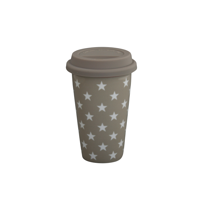 Kubek ma kolor brązowy i zdobiony jest białymi gwiazdkami.