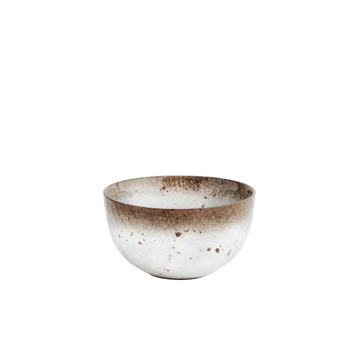 Miska jest ręcznie wykonana z kamionki w kolorach bieli i brązu.