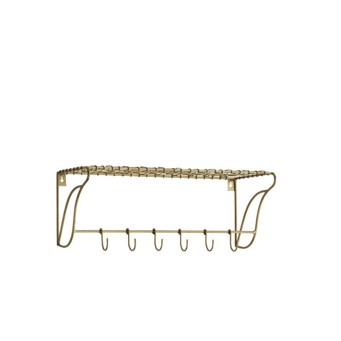 Półka wykonana jest z metalu w kolorze antycznego mosiądzu i dodatkowo posiada 6 haczyków do zawieszenia.