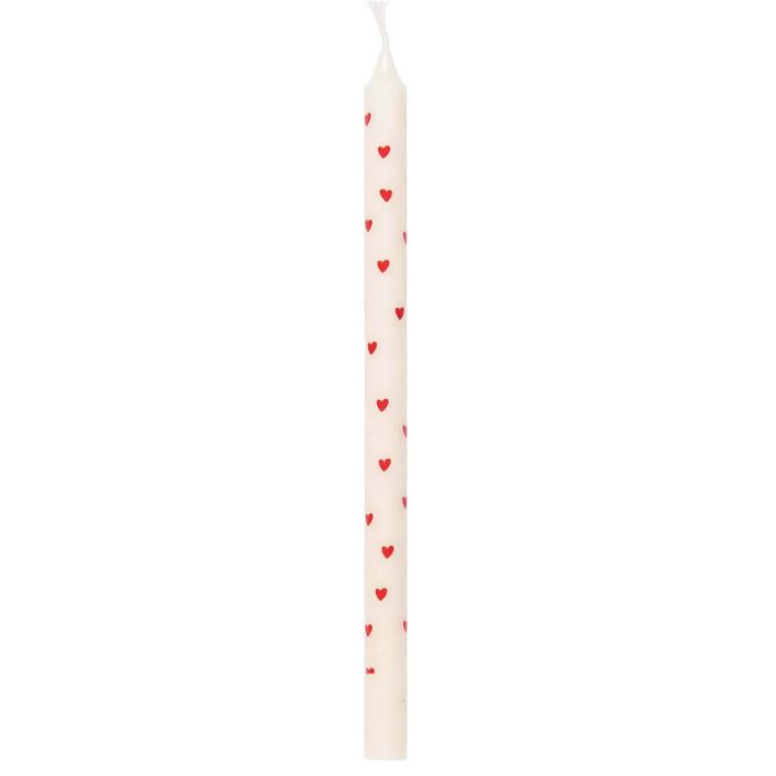 Wysokiej jakości świeczka w kolorze kremowym zdobiona motywem serc i wykonana ze stearyny.