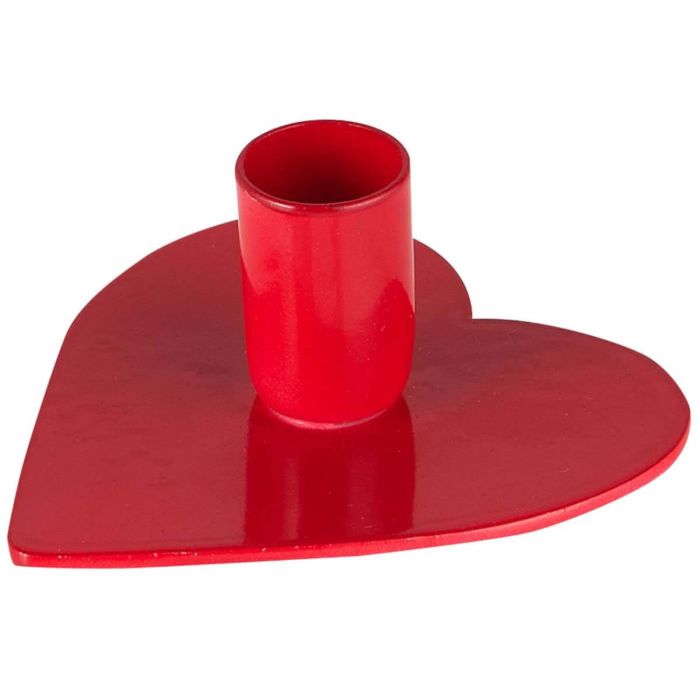 Uroczy świecznik w postaci serca wykonany z metalu w kolorze czerwonym.